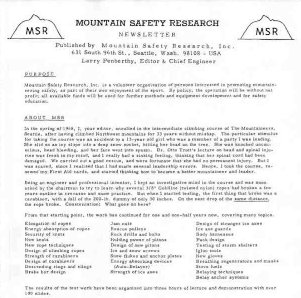 래리 펜버티는 자신의 이야기와 생각 그리고 등산 가이드등 다양한 정보를 제공하고 있었습니다. 하지만 당시에는 표준이 아니였기에 종종 논란의 소지가 있었다고 합니다. 지금도 미국 MSR 홈페이지에서 그 당시의 소량의 뉴스레터를 제공하고 있습니다.